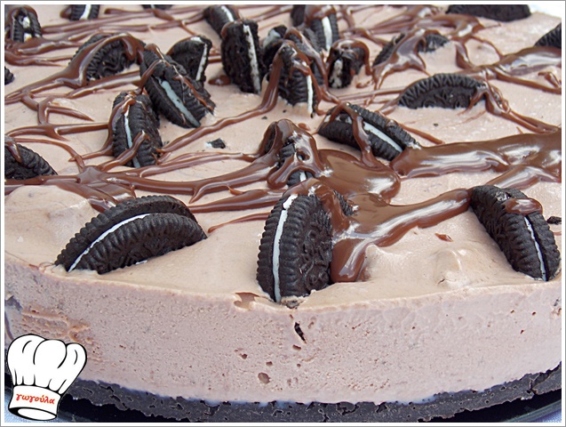 σκεπαζουμε με σελοφαν και παγωνουμε πολυ καλα το παγωτο στην καταψυξη και απολαμβανουμε.Μπορουμε να το σερβιρουμε με σιροπι σοκολατας η'βυσσινου και να διακοσμησουμε επισης την επιφανεια της τουρτας με μπισκοτα.
