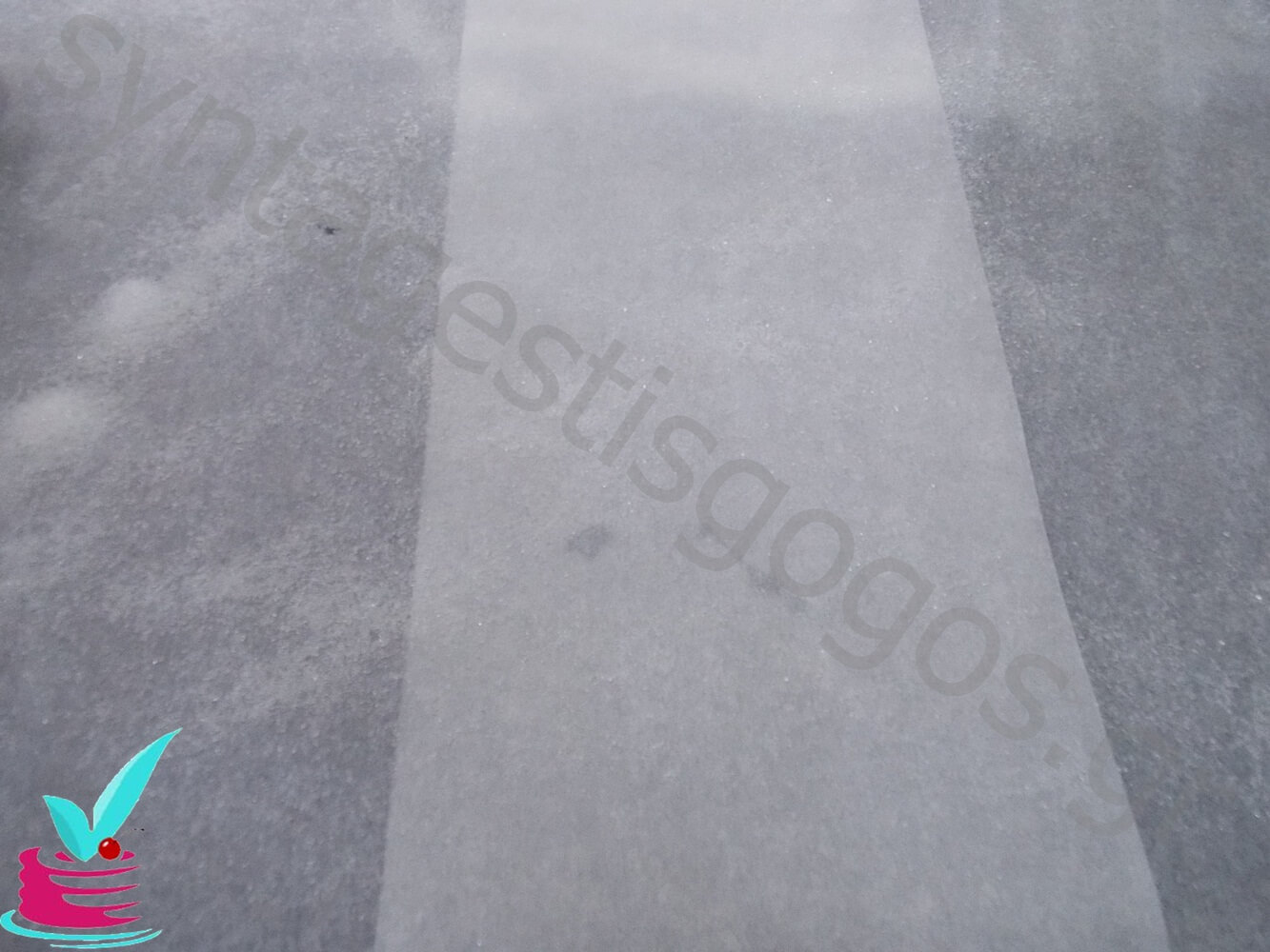 Οσο ειναι ακομα ζεστο και μαλακο το παντεσπανι στρωνουμε στον παγκο μας λαδοκολλα την πασπαλιζουμε με κρυσταλλικη ζαχαρη.