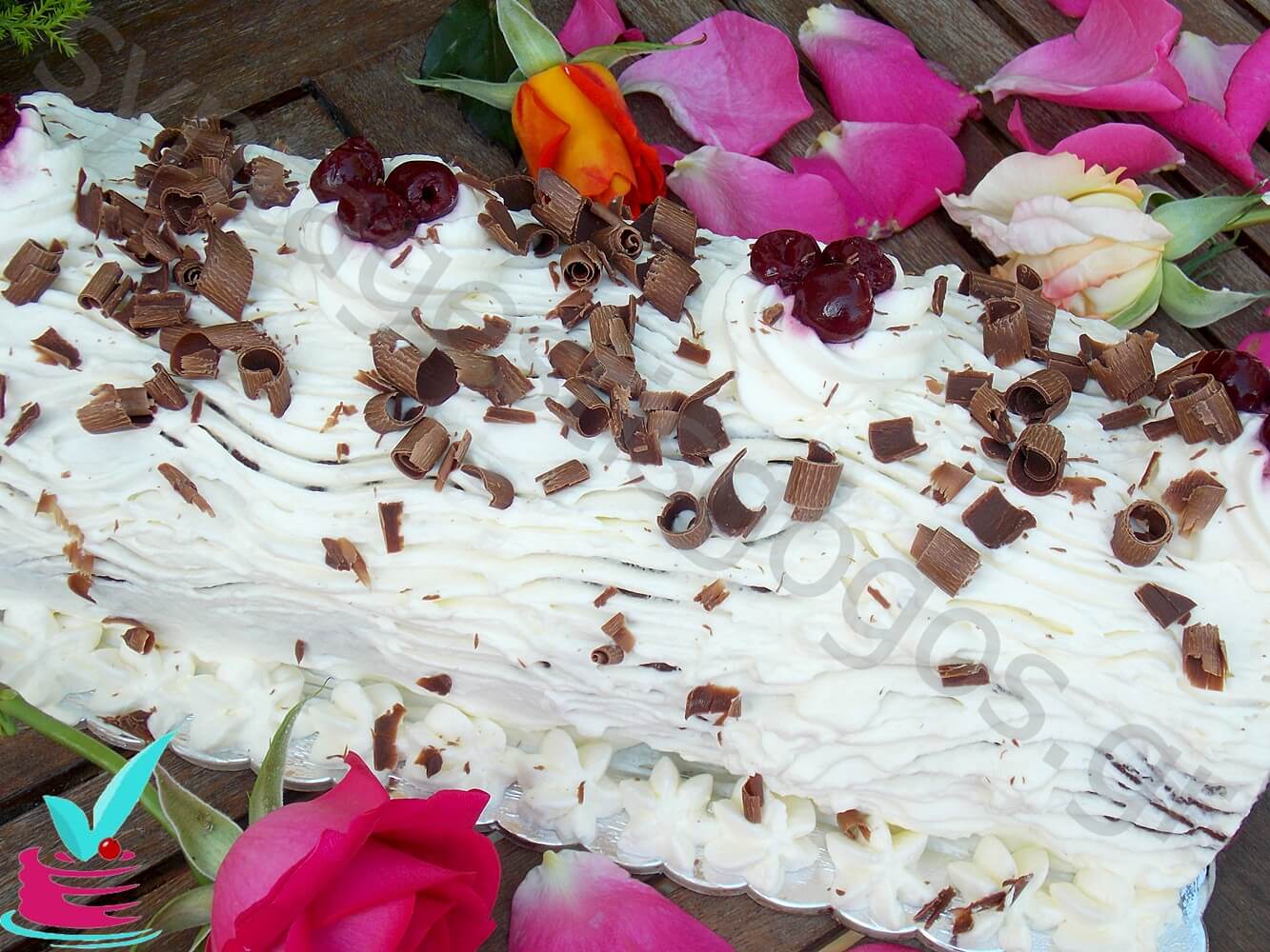 Κατοπιν προσθετουμε την σαντιγι (κραταμε ενα μερος για την εξωτερικη επικαλυψη του κορμου) τα βυσσινα και τις νιφαδες κουβερτουρας.