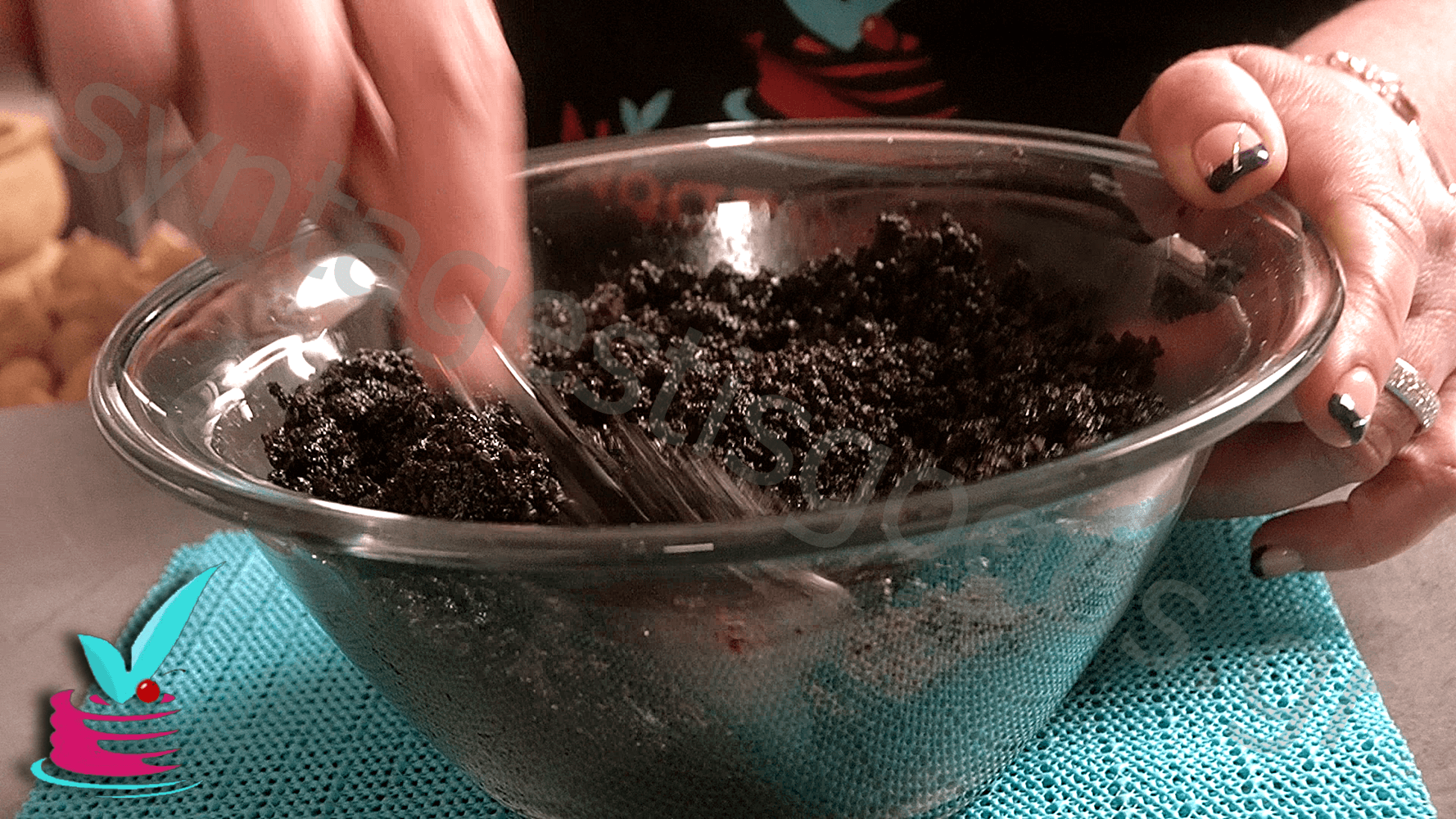 Θρυμματίζουμε τα μπισκότα μας στο μούλτι, τα μεταφέρουμε σε μπόλ και προσθέτουμε το βούτυρο.Τα ανακατεύουμε πολύ καλά να βραχούν τα μπισκότα μας.