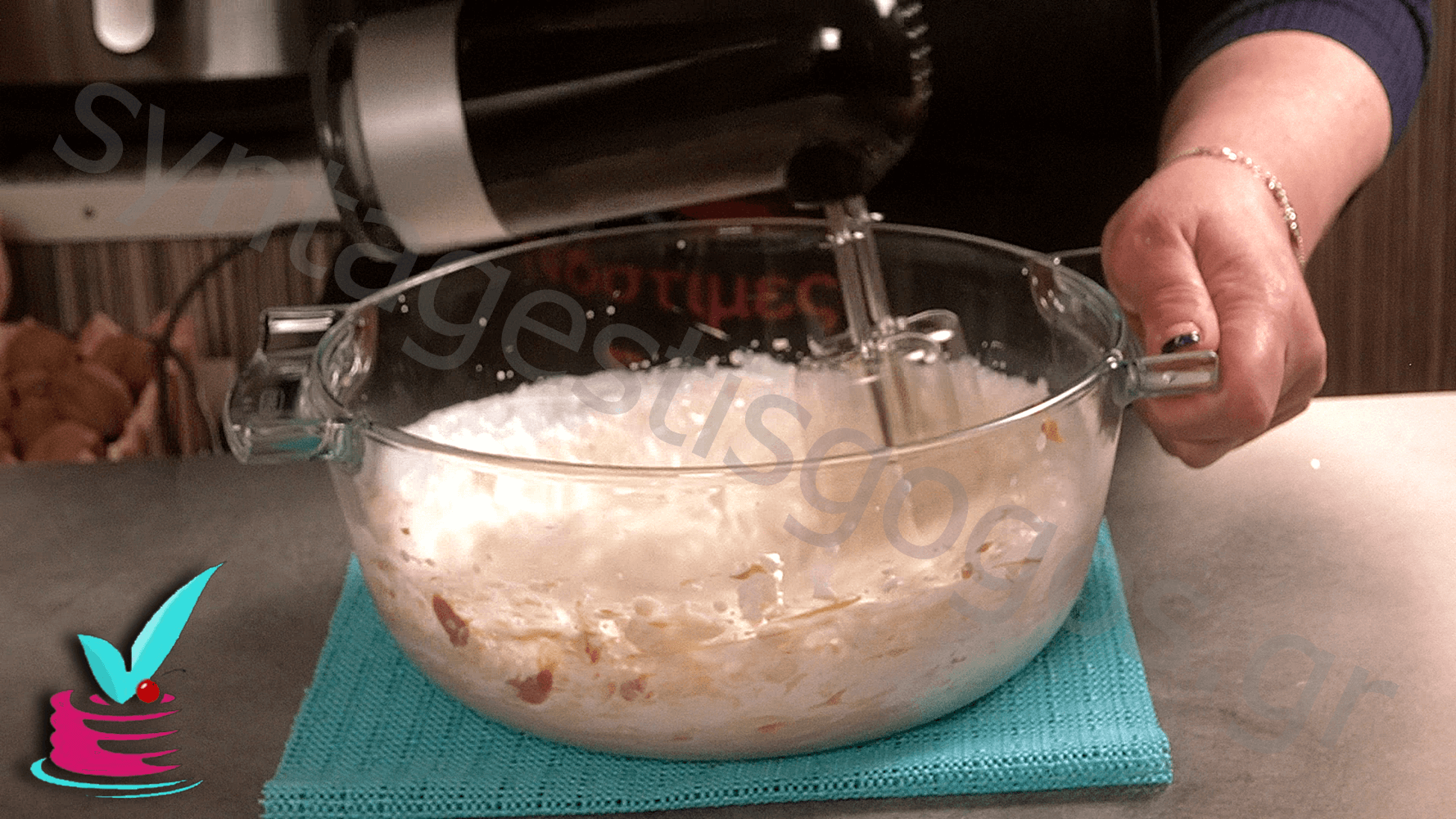 Προσθέτουμε την κρέμα γάλακτος και χτυπάμε μέχρι να αφρατέψουν τα υλικά μας.